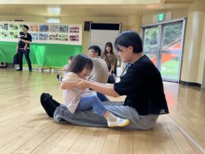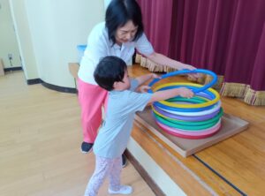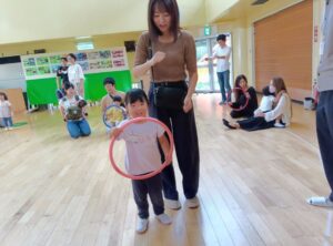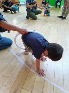 後半では、フープをトンネルにしてくぐったり、ハンドルに見立ててドライブごっこをしたり、音やリズムに合わせて様々な形で身体を動かしました。