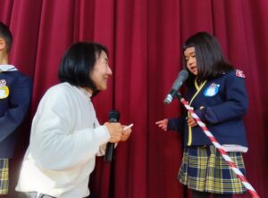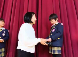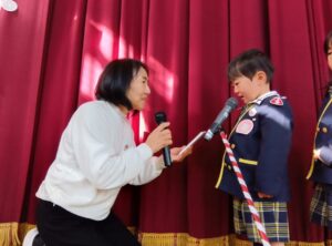 園長先生から教育目標である「つよく あかるく かしこいこ」についてのお話があり、子ども達は2学期を頑張ったことなどを振り返りました。そして各クラスの代表のお友達が“あゆみ”を受け取りました。